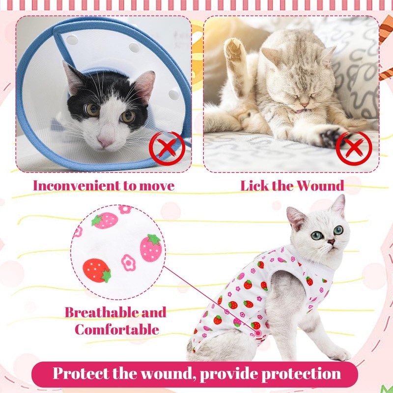 - 😽PACKAGE CONTENTS -- Provide a Strawberry Pattern cat recovery suit fit for Spring and Summer with a back length of 11.81", chest girth of 15.35" and neck girth of 11.02".Suitable for cats of about 9.9pounds.
