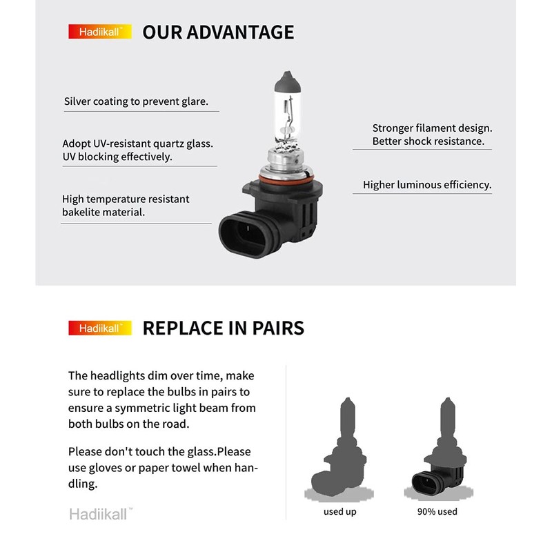 - RELIABLE DESIGN: Each of Hadiikall 9006 headlight bulbs is 12V, 51W and 1095LM with American DOT certification.