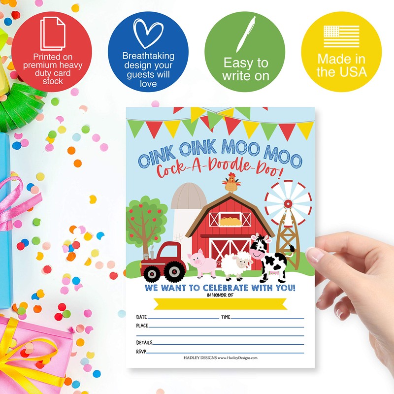 - Best party invites cards for kids children and adults; The recipients of these cute and colorful cartoon oink, moo, cock-a-doodle-doo cards are going to love getting a personal invite card for your baby baptism, 1st, 2nd, 3rd birthday parties, event gender reveals, and more with these exclusive one of a kind fill the blank cards! The bright unique farmyard themed country style invite is easy to add a personal message to. Begin the party with this perfect farming bundle item accessories idea.