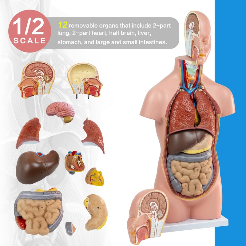 - 12 removable organs that include 2-part lung, 2-part heart, half brain, liver, stomach, and large and small intestines. Those portable models are designed and crafted with utmost anatomical details. They are a fun way to learn.