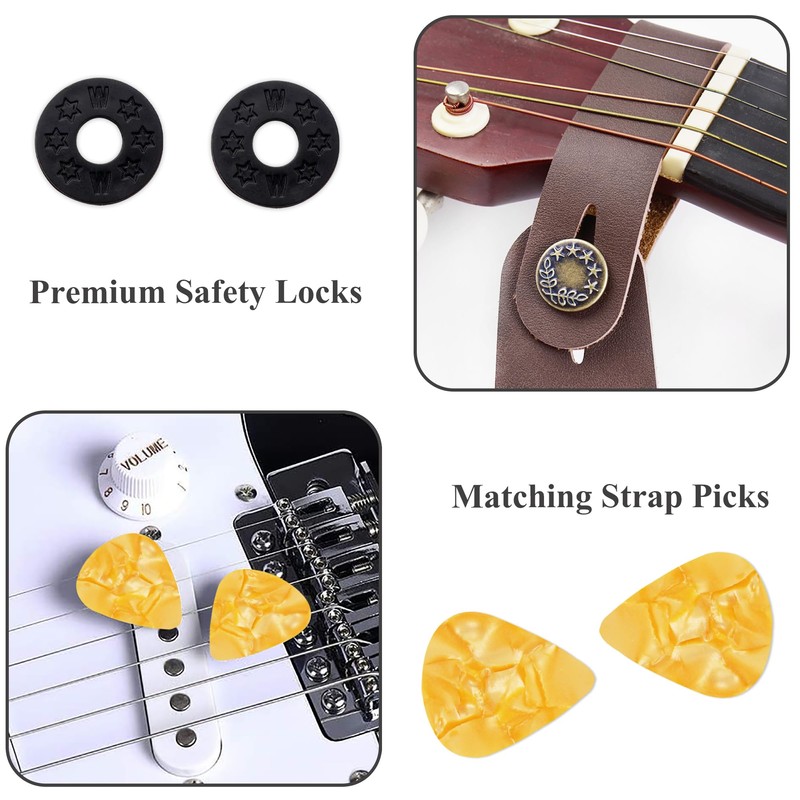 - PACKAGE INCLUDE: 1 x Guitar Strap, 1 x Leather Strap Button, 2 x Strap Locks, 2 x Picks,2 x Picks Holder.
