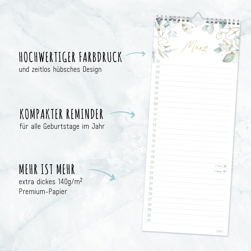 Häfft® Birthday Planner, Wall Calendar, "Gold Leaf", 12 x 30 cm, Undated, Year-Independent/Wall Planner, Sustainable and Climate Neutral