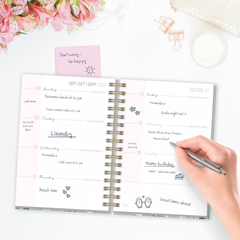- YOUR WEEKLY PLANNER 2025 A5 - Hardcover calendar in English and additional languages: French / Italian / Spanish, 1 week on 2 pages, space for notes & to dos, monthly overviews and many specials! With shiny cover embossing