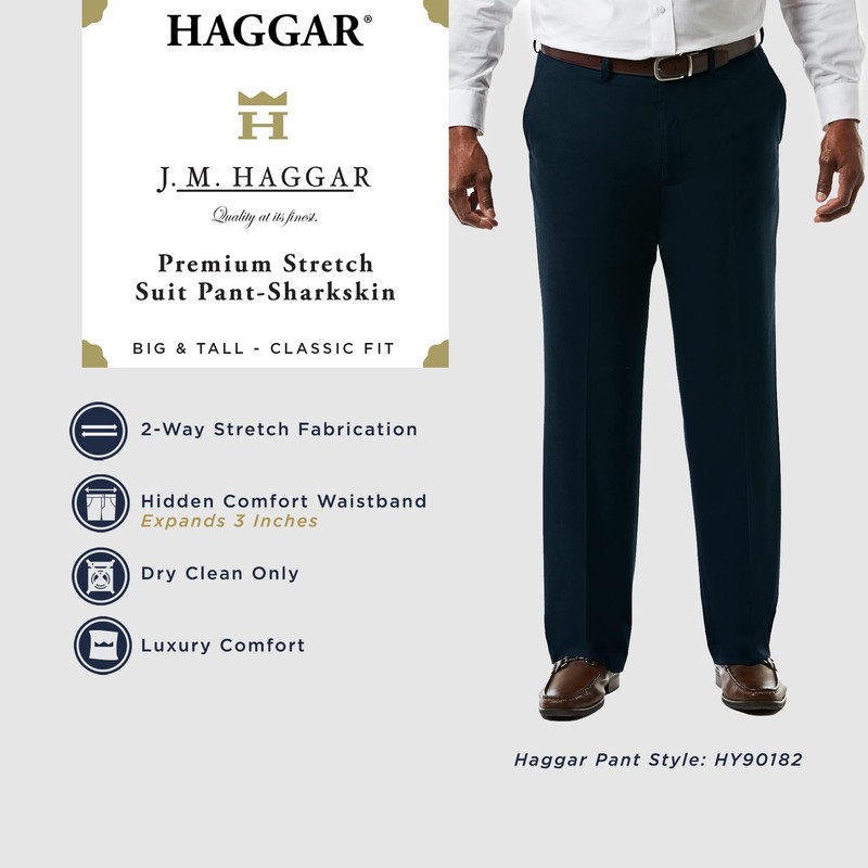 - SUIT PANT: The J.M. Haggar suit collection checks all of the boxes. Featuring a hidden expandable waistband that stretches up to 3", a hook and bar closure, off seam front pockets, single welt back pockets in a classic fit flat front silhouette.