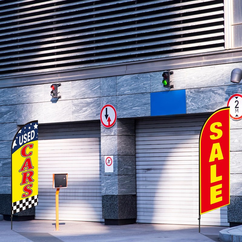 - Stability Design: designed with stability in mind, our second hand cars themed feather flags remain upstanding even in challenging winds; This stability is assured by their construction with quality aluminum and fiberglass materials and the inclusion of a ground stake in the package