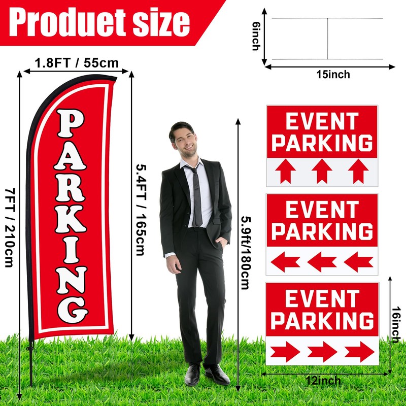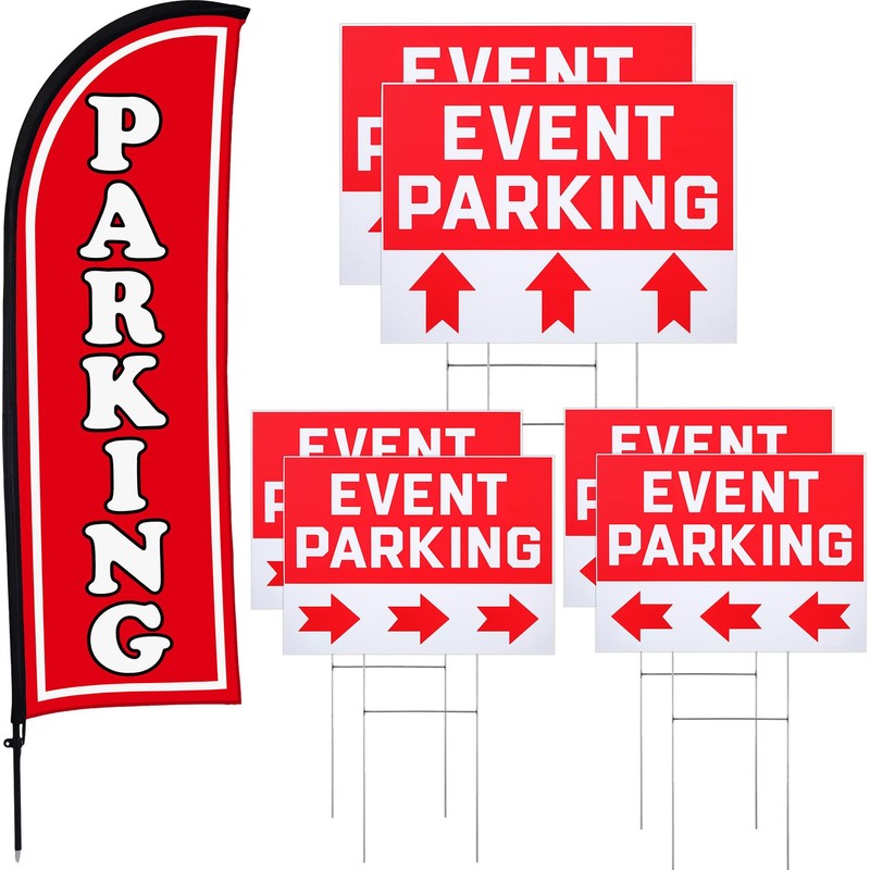 - Package Included: this parking sign kit includes 1 pack of parking sign flags (with flagpole and black bag), 6 packs of plastic double sided event parking arrow signs (with 3 solid h stakes), flags measure 7 x 5.4 feet, and these directional arrow signs measure 12 x 16 inches; This parking sign kits can meet your usage needs, use multiple flags to cover all your bases for better guidance