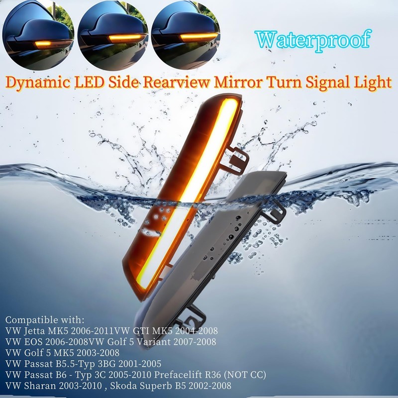 - Perfect Fit:Side mirror lights specifically designed for VW Golf 5, EOS GTI, Jetta MK5, Passat B5.5/B6, R36, Sharan,Skoda Superb B5, R32, and Rabbit models, ensuring seamless integration with your vehicle