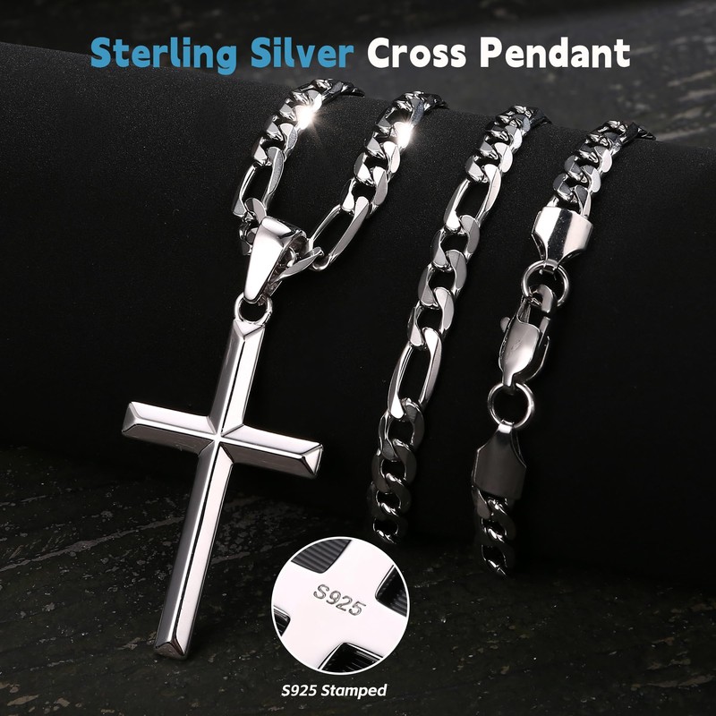 - Premium Material: Beveled edge cross pendant was crafted from sterling silver with S925 metal stamp. Surgical grade titanium steel figaro chain, stronger more than other chain, nickel and lead free, hypoallergenic for sensitive skin, used for long time