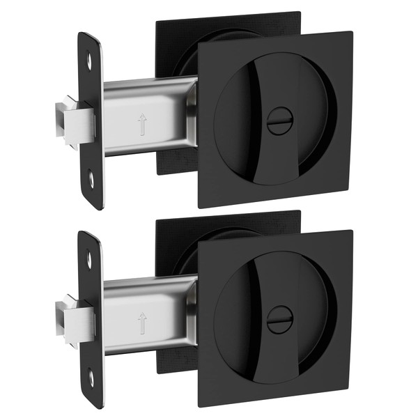 Haidms 2 Pack Matte Black Pocket Door Lock and Handle - Square Black Pocket Door Hardware