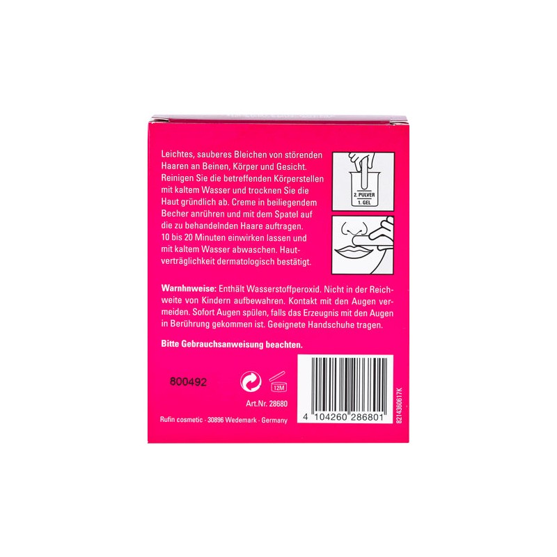 Mix the hair bleaching cream, apply to the body part to be treated with the enclosed spatula and leave on for 10-20 minutes. Then rinse with cold water.