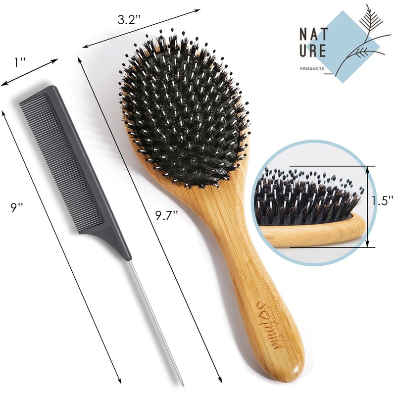 • ❤MARVELOUS MATERIAL: Our hair brush is made with a bamboo handle, 70% natural boar bristles, and 30% nylon pins. The boar bristle helps smooth out the scales of our damaged hair, making it softer and shinier, hence acting as a natural conditioner. The nylon pins tips penetrate deep into the scalp to soothe follicle pressure and cling to the scalp, as well as remove oil and dandruff. Prevent clogged pores and keep your scalp healthy.