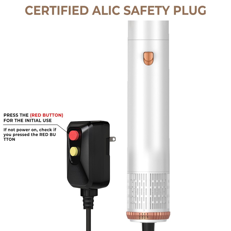 - [SAFETY FIRST] - We prioritize safety with an NTC feedback system, a bi-metal thermal switch, and an irreversible fuse. The hot air brush offers a quick cooling function by double-clicking the temperature button. Comes with heat-insulating gloves in case of burns. The air styler for hair curling with an Ergonomic button design, concentrated on the upper part of the body, prevents accidental clicks, also we added an ALCI plug to this hair-drying brush.