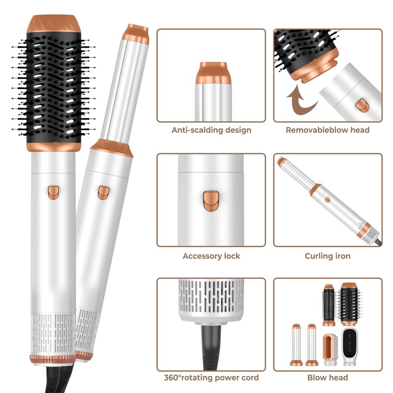 - [6-in-1 Styling System – Curl, Volumize, or Straighten with Ease] - This multi-styler set includes a hair dryer styler includes 1*Hair Dryer, a Hair Straightening Brush, 2*Left Right Hot Air Curlers, 2* Styling Brushs for curling and volumizing, 1*Massage Oval Brush for daily combing , a Heat-Resistant Glove, a Storage Bag. NOTE: During the few minutes of initial use you may notice a slight odor which is completely normal and it will quickly disappear.