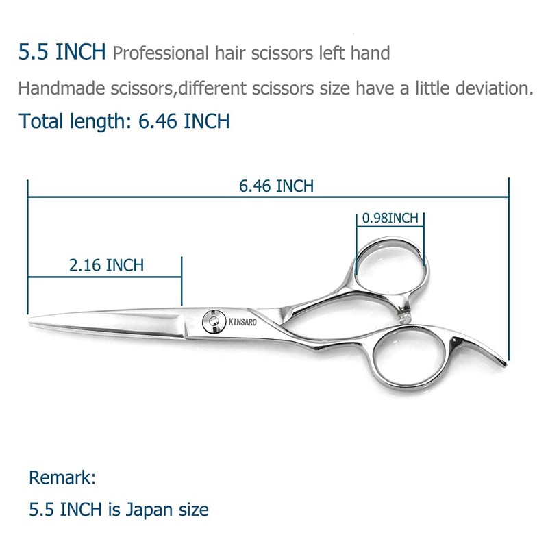 - Classic style left hand hair scissors,lefty barber scissors.This hair scissors only be used for left hand.This scissors for cutting thin hair.Total scissors length 6.46 INCH.5.5INCH is Japan size