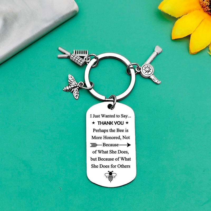 - Appreciation Gift for Hairdresser Keyring :The Hair Stylist Appreciation Gifts engraved "I just wanted to say... THANK YOU Perhaps the bee is more honored, not because of what she does, but because of what she does for others"This Hairdresser Keyring would make a perfect Hairdresser Gift. Great hairdresser birthday gift or hairdresser gift. Any Hairstylist is sure to love it!