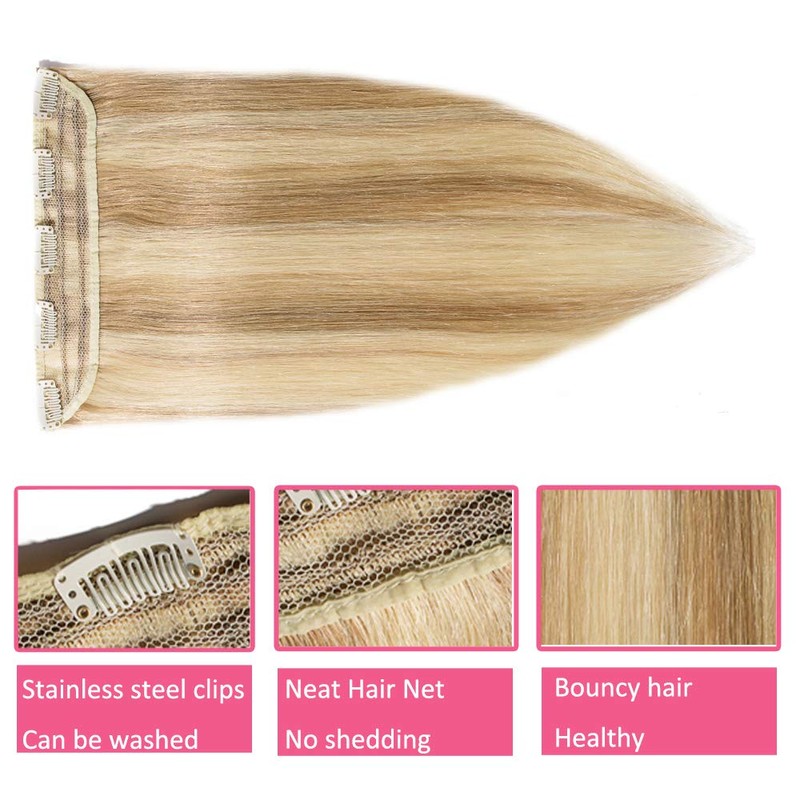 - One-piece 5A clip in hair is incredibly easy to wear and remove. Wide weft covered with net, no shedding, avoid tangle with your own hair.