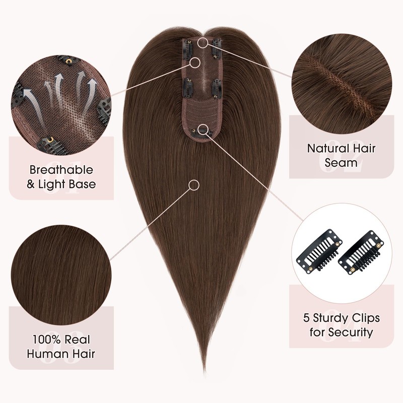 Hairro Human Hair Topper, Clips in 100% Real Hairpieces for Women, 2.25"x6" Silk Base Lightweight, Invisible Natural for Covering Thinning Hair/Adding Volume, 8 Inch Classic Brown