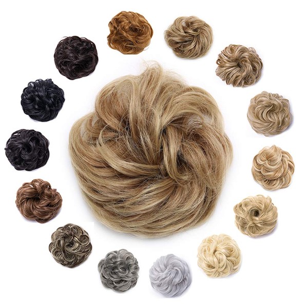 Hairro Messy Hair Bun Synthetic Scrunchy Donut Wavy Updo Elastic Scrunchie Thick Full Wedding Hair Pieces Bridal Hairpiece Easy Bun Updos for Women Kids 1pcs 40g #12T24 Light Brown Mix Ash Blonde