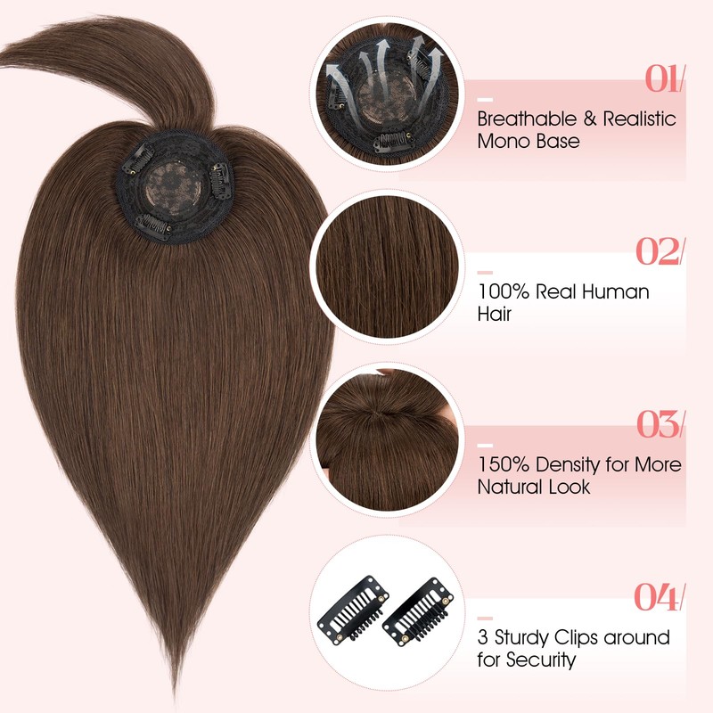 - Secure and Easy Clip-in Design:Our mono topper is equipped with three 1.1" anti-slip and invisble clips (2 front, 1 back). They're easy to clip in, just taking seconds. The clips hold firmly during various activities, are gentle on your hair and scalp. However, they may not be suitable for people with extremely thin or balding areas.