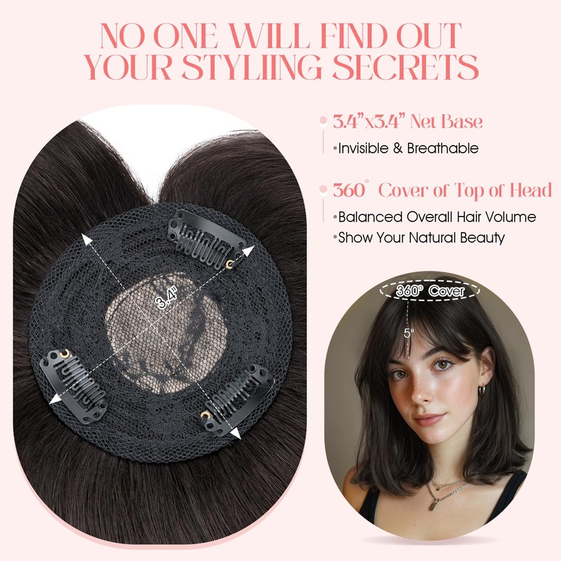 - Innovative Mono Base Structure:Our topper with bangs is made with a 3.4"x3.4" net base and the simulated biological silk scalp make it more natural. The head - swirl is machine - stitched, and the rest is hand-made with lace net. The silk scalp net surface not only looks realistic but also offers good breathability for all - day comfort.