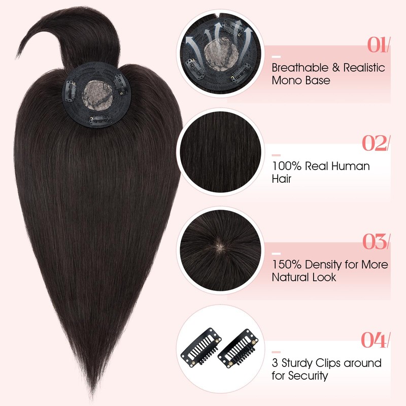 - Secure and Easy Clip-in Design:Our mono topper is equipped with three 1.1" anti-slip and invisble clips (2 front, 1 back). They're easy to clip in, just taking seconds. The clips hold firmly during various activities, are gentle on your hair and scalp. However, they may not be suitable for people with extremely thin or balding areas.