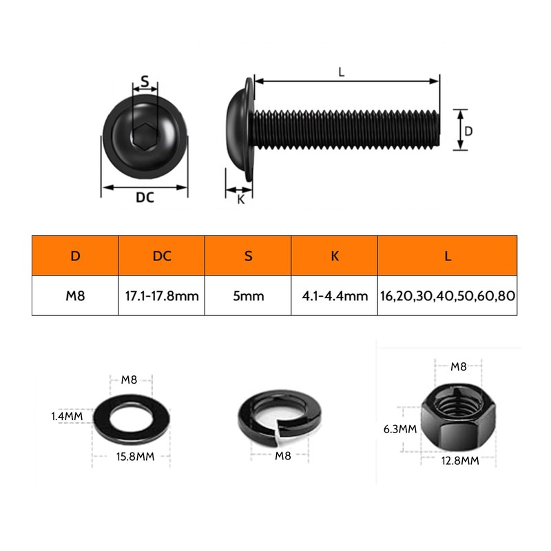 - Product size: Thread diameter: M8,Screw length:16 mm. Innensechskant width: 5mm,Package includes: 10 pcs (Socket Cap Bolt,Hex nuts,Flat washers,Spring Lock Washers)