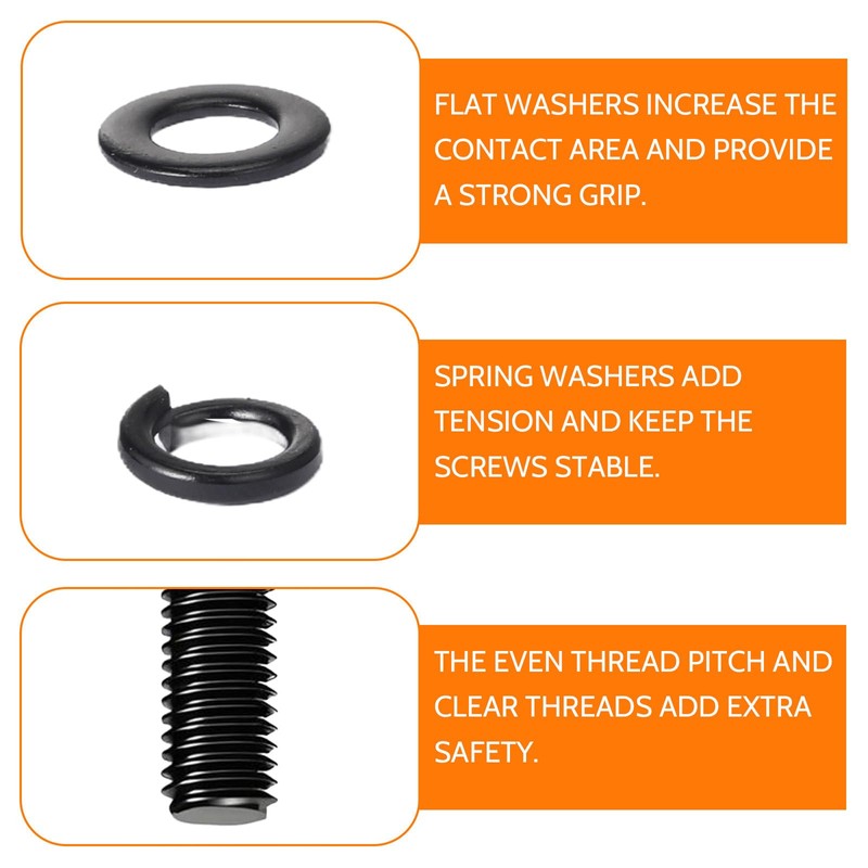 - Safe Use:The included nuts and washers increase the contact area with the screws and bolts, reduce pressure, and prevent deformation or shifting during use. The uniform thread and clearly visible pitch provide secure hold and protection during application.