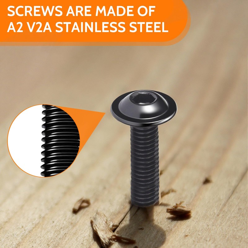 - High-Quality Material:Our flanged button head socket cap screws, nuts and bolts are made from high-quality A2 V2A stainless steel. The surface is oxidized to ensure excellent corrosion resistance and to prevent oxidation and rust.