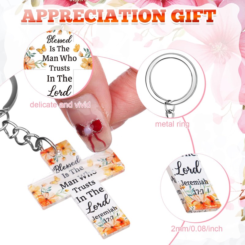 Cross Shaped Design:The Christian keychain gifts feature an aesthetically pleasing cross shaped design;Each Christian cross keychain is adorned with a classic bible verse quote,such as [God is within her],featuring impressive floral patterns;This design is not only the clear embodiment of the Christian faith,but it also serves as an elegant and stylish accessory