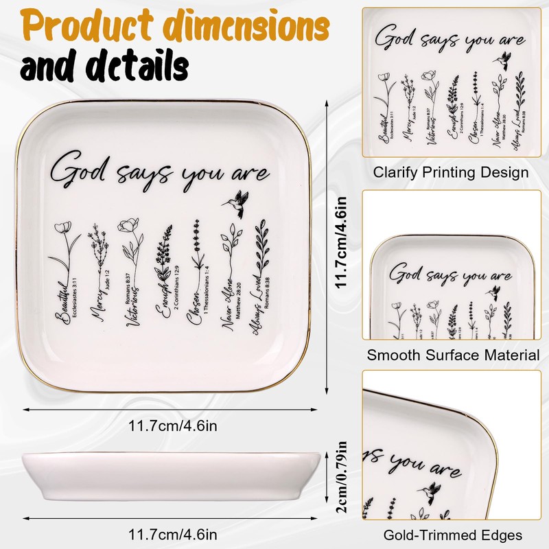 - Meaningful Design: The jewelry tray dish features a classic, pure white design with Christian themes such as floral patterns and inspirational words such as God Says You are. This personalized jewelry tray is great gifts for the holidays. It brings beauty and inspires spiritual inspiration.