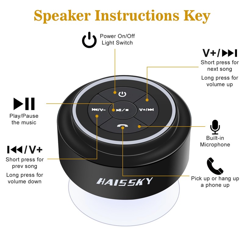 - FULLY WATERPROOF, EVEN FULLY SUBMERSIBLE: With Its level IPX7 certification the Haissky shower speaker is so versatile around water it's not just water resistant it's capable of being fully immersed in water up to 3 feet in depth. Listen to your favorite music with this fun unit. You can even receive incoming calls while in the shower, bathroom, car, boat, beach, patio or anywhere else without risking your expensive mobile device as it is also shockproof and dustproof