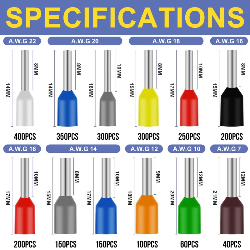 - High Quality Materials:The 12 types wire end ferrule terminals are made of tinned copper and nylon insulating sleeve,suitable for AWG 22-7 wire.The nylon sheath has the characteristics of insulation and flame retardant, which is safe and reliable.Strong electrical conductivity.