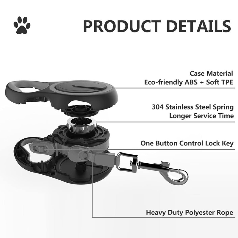 1.One Button Brake & Lock,equipped with 6ft/5M nylon ribbon,you can easily lock and retract dog leash smoothly to your desired leash length.