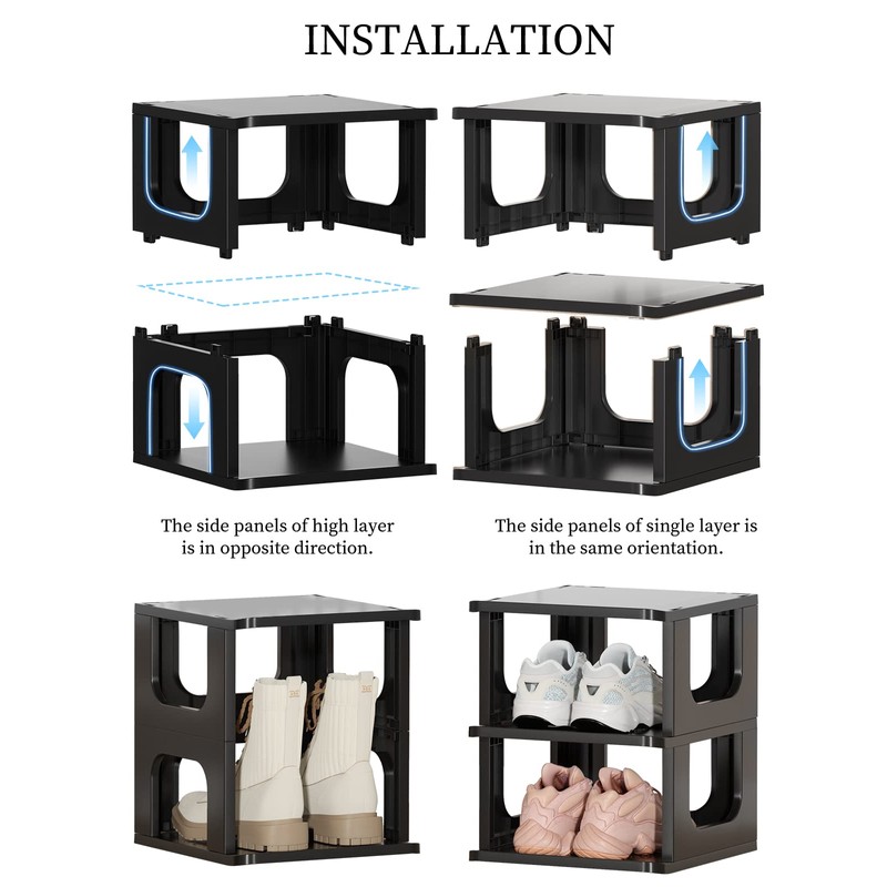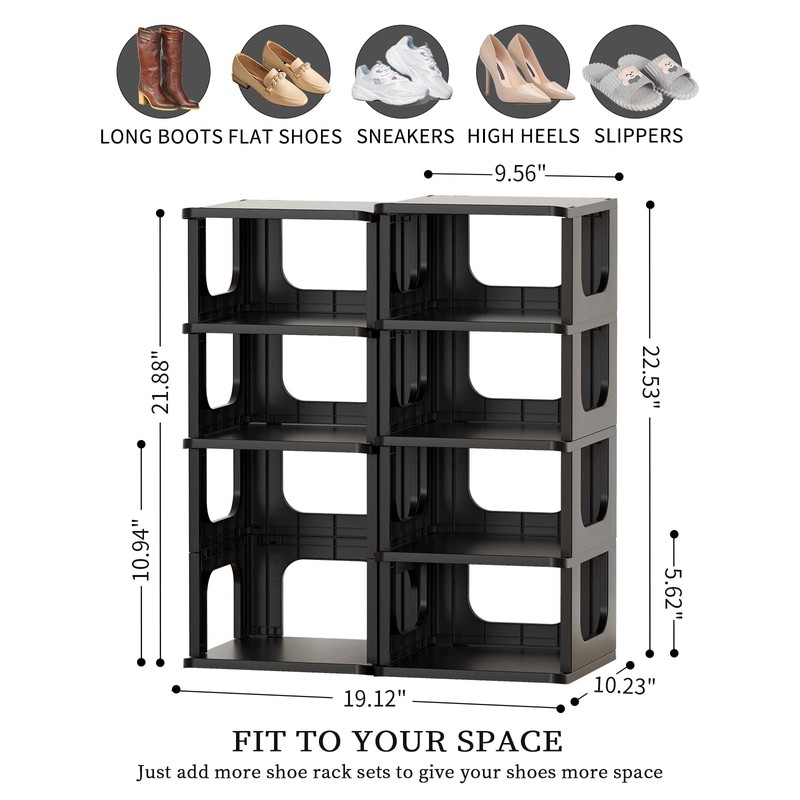 - 【Upgrade Removable Partition Panel】Upgrade shoe rack perfect fits most of shoes type, Freely assemble to change the height. Each 2 shoe cubes can be assembly into a high module to place your boots and high heels. The height of a single layer is about 5.63 in, the highten layer 11.47 in. Not only can you storage flats, slippers, but also can remove the one layers to store boots, high heels, or other larger accessories to suit different scenarios.