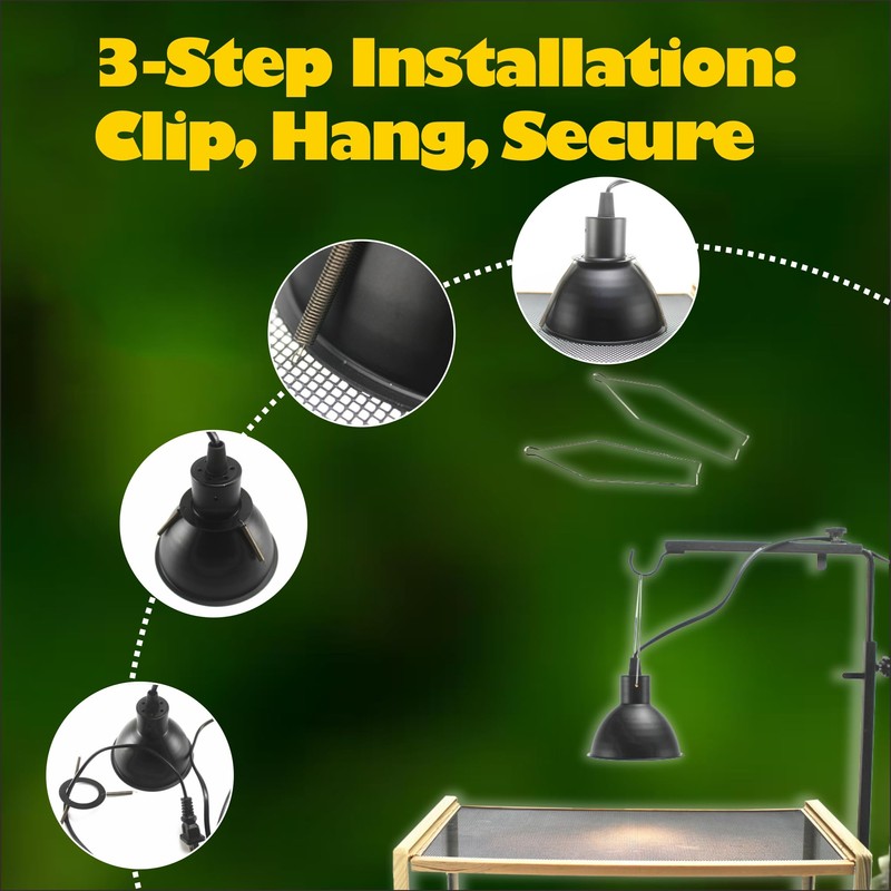 - 【High-Temperature Resistance & 360°Adjustable】Heavy-duty steel brackets and spring clips withstand heat up to 302°F (150°C). Swing arms allow flexible positioning for basking zones.