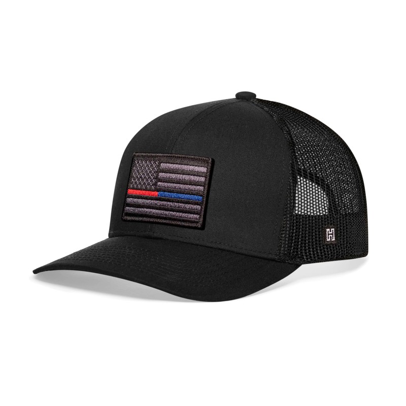 - THIN RED & BLUE LINE AMERICAN FLAG HAT - Back First Responders and show your support for American Fire Fighters & Law Enforcement with this thin red & blue line trucker hat