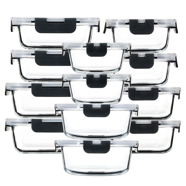 HAKEEMI 12 Pack Glass Storage Containers with Lids, Glass Meal Prep Containers Set, Airtight Food Storage Containers, Grey