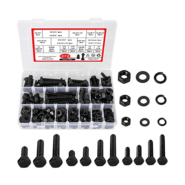 - √ [272Pcs Bolts Nuts and Washer Assortment Kit with SAE System, More Size, More Quantity] Various size of 3/8" 1/4" 5/16" screws and nuts, flat washers, spring washers total 272pcs.