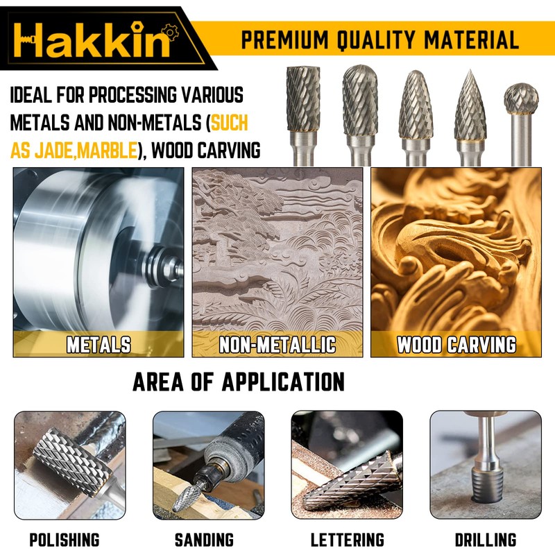 - 【High Hardness】Machining hardness is up to HRA85. Carbide rotary burr set processing various of metal(burr bits for metal carbide burrs for steel including most sorts of hardened steel) and non-metal (such as marble, jade, bone).