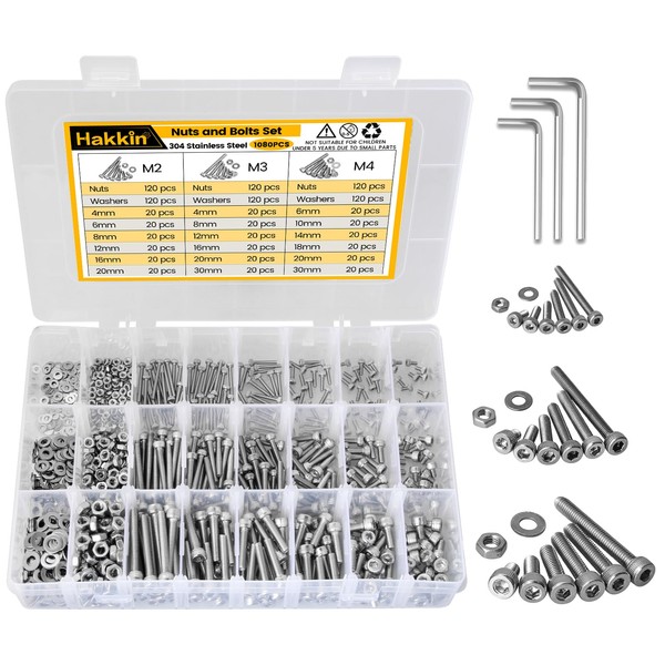 Hakkin Nuts and Bolts 1080Pcs M2 M3 M4 Hex Socket Head Cap Screws 304 Stainless Steel Nut Assortment Hex Socket Machine Screws Hex Socket Bolts Nuts and Washers Assortment Kit
