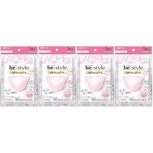 Hakugen Earth Bee Style Mask, 3D Type, Regular Size, Dolly Pink, Pack of 5, Set of 4