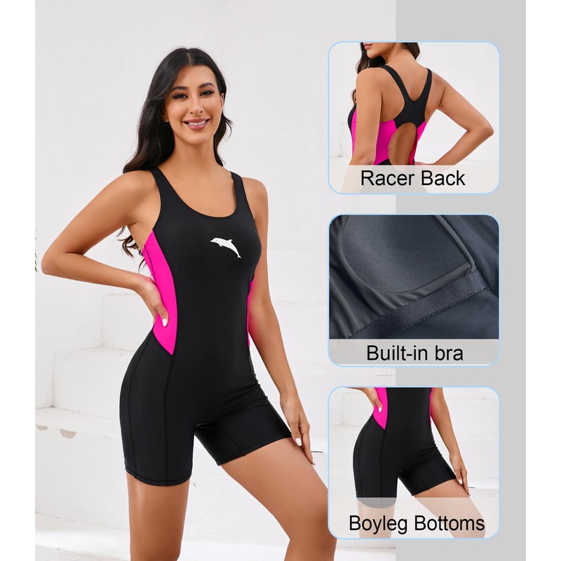Halcurt Women's Boyleg Athletic One Piece Swimsuit with Boyshorts Racerback Sport Bathing Suit Black Hot Pink1 M