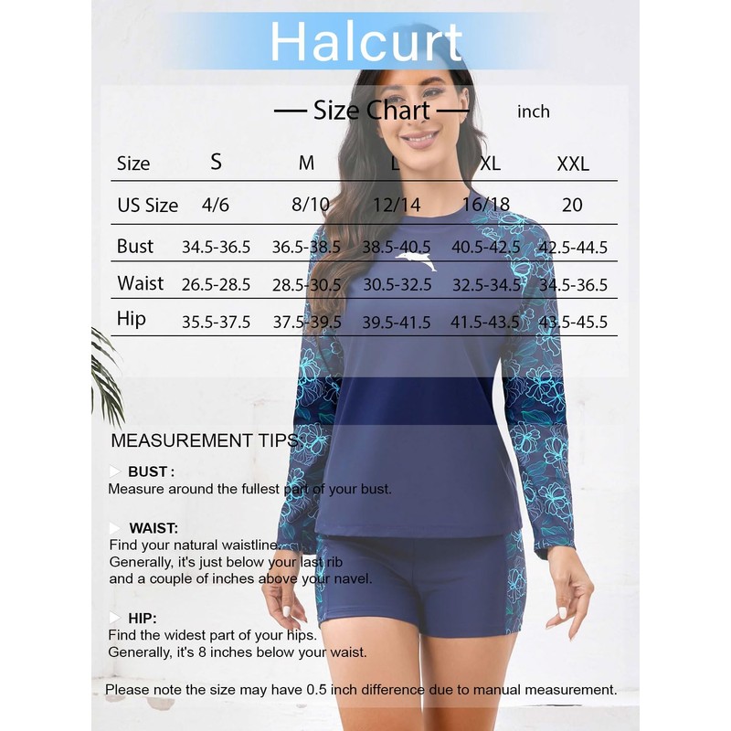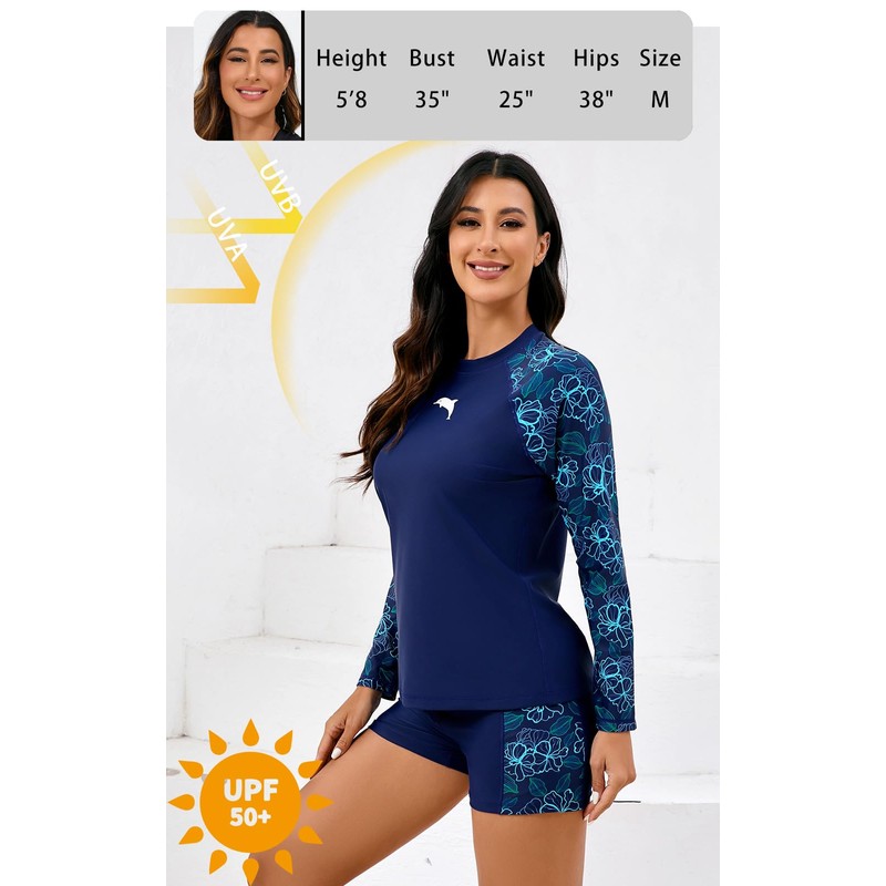 Halcurt Women's Built in Bra Rash Guard Long Sleeve Swimwear UPF 50 Two Piece Swim Shorts and Tops, Navy Blue Floral, XX-Large