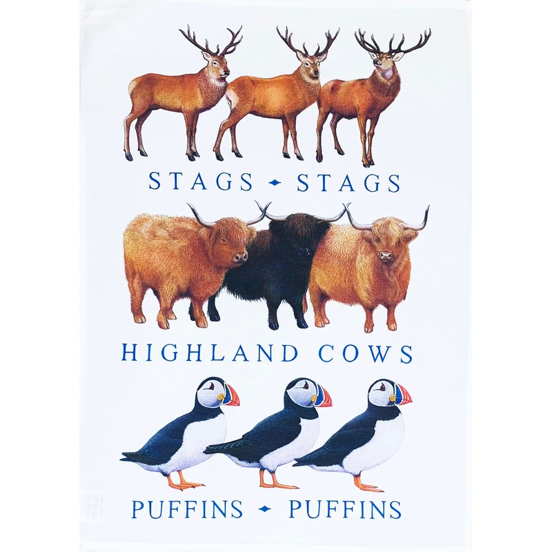 - Scottish Iconic Animals large cotton tea towel - Stags, Cows and Puffins