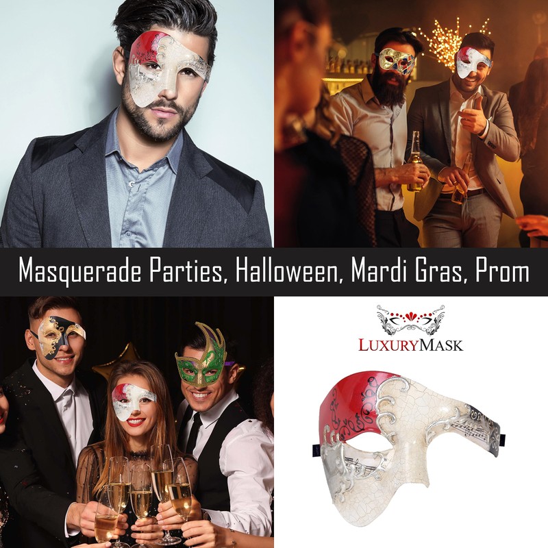 Half Face Masquerade Mask For Men Phantom Of The Opera Mask for Masquerade Party, Venetian Party, Mardi Gras, Halloween & Cosplay (Red/Silver)