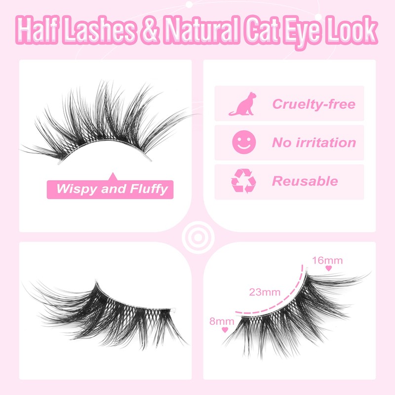- 💓Half Lashes Natural Look:Do you like simple makeup?8-16mm long half eyelashes, giving you the perfect cat eye effect.They can lift your eyes, but not too dramatic. The popular cross design mimics the real eyelash structure, making these lashes look natural yet sexy