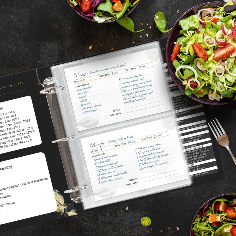 - 📄CRYSTAL CLEAR - High-quality crystal clear plastic ensures that the contents of the recipe cards protector are easily visible & the contents remain in a safe environment keeping them safe from external hazards. Reduced glare helps you view your recipes with ease regardless of the angle or lighting.