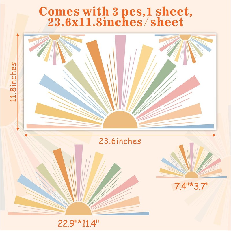 - Boho Sun Wall Stickers: comes with 1 sheet, large vinyl sunshine boho rainbow half sun wall decals.