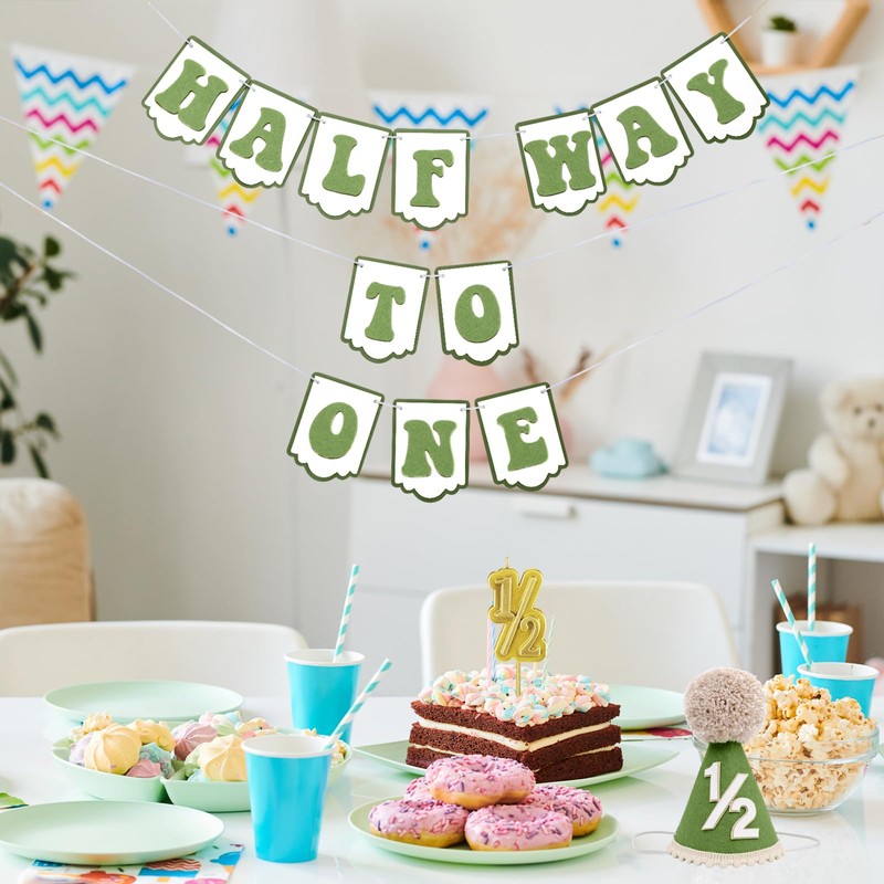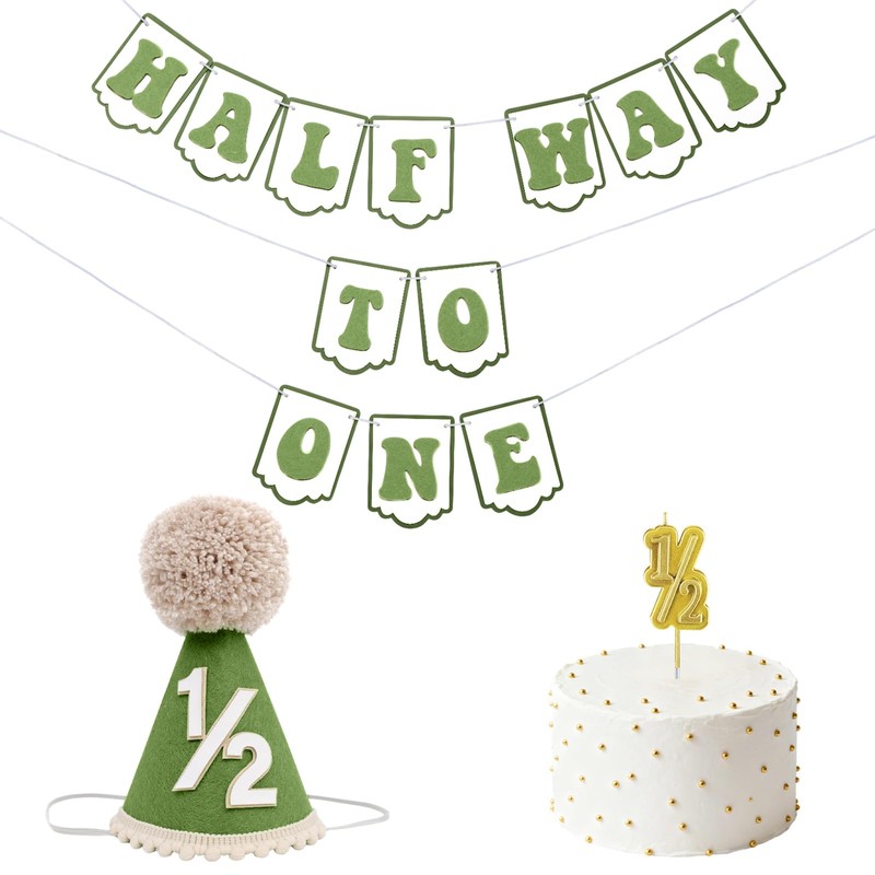 Half Way To One Banner - Half Birthday Decorations for Boys Girls, 6 Months Birthday Decorations With 1/2 Birth-day Hat 1/2 Gold Number Candles And HalfWay To One Banner for Baby Party Supplie(Green)