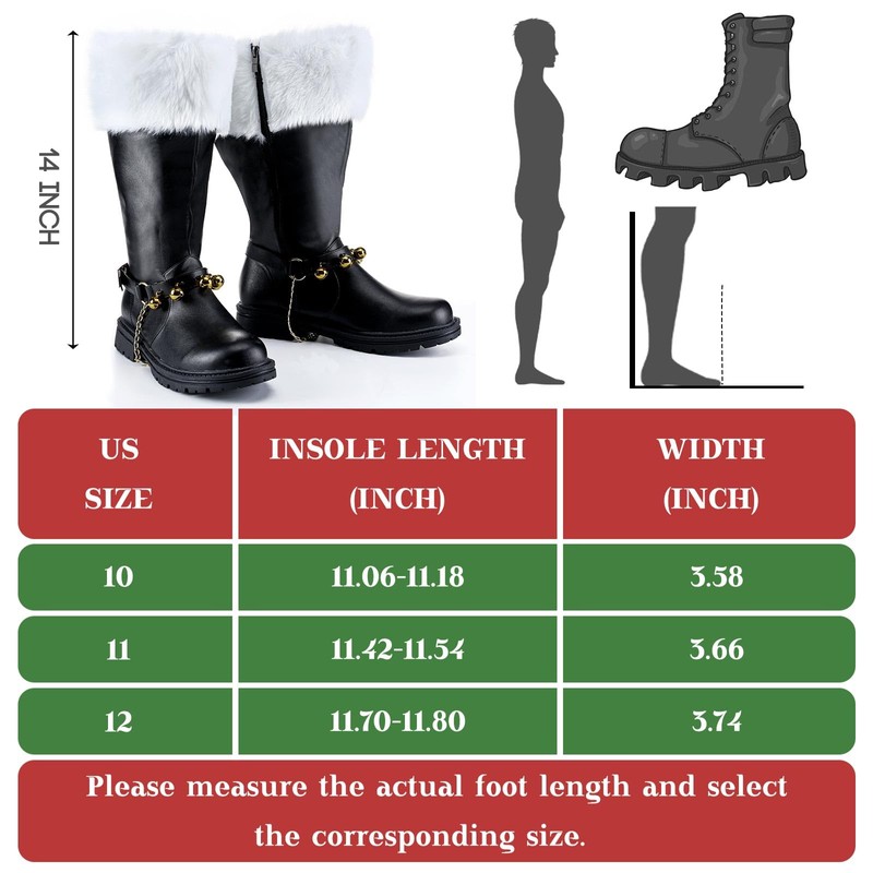 - Santa Claus Boots: the package includes 1 pair xmas Santa Claus boots for men; Comes with unforgettable sleigh bells for the ideal festive atmosphere; Please check our size chart before purchasing